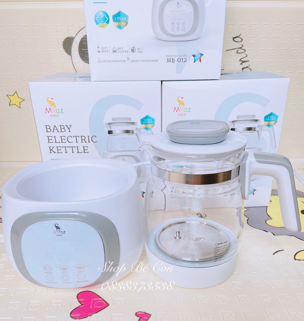 Việc chăm sóc bé hằng ngày khiến mẹ trở nên bận rộn, mệt mỏi, ít có thời gian để chăm sóc cho bản thân. Ngay lúc này mẹ cần có một "người bạn", "người trợ thủ" đắc lực, giúp mẹ chăm sóc bé và gia đình một cách tốt. Bình đun nước Moaz Bébé thông minh MB-002 dưới đây với các ưu điểm nổi bật như giữ nhiệt độ nước ổn định trong suốt 24 tiếng, chế độ khử clo thông minh cùng màn hình cảm ứng hiển thị rõ ràng, giúp mẹ chuẩn bị nhanh chóng và tiện lợi hơn ly sữa ấm cho bé, tách cà phê hay cốc trà nóng cho bản thân và các thành viên vô cùng tiện lợi. Đặc điểm nổi bật của sản phẩm Bình đun nước Moaz Bébé thông minh MB-002 có thiết kế hiện đại, màu sắc tinh tế, nhã nhặn, phù hợp với nhiều không gian gia đình. Là sản phẩm đa chức năng: đun nước, hâm nước pha sữa, pha trà, pha cà phê được cài đặt và thực hiện nhanh chóng, dễ dàng Chế độ khử Clo thông minh giúp nước trở nên tinh khiết hơn, bảo đảm an toàn cho bé trong quá trình sử dụng. Màn hình cảm ứng hiện đại, hiển thị chính xác nhiệt độ và rất dễ sử dụng Sensor IC 3.0 đo nhiệt độ chính xác hơn. Thời gian duy trì nhiệt độ cài đặt lên tới 24 tiếng liên tục, bình đun nước Moaz BéBé thông minh MB-001 sẽ là trợ thủ đắc lực, sẵn sàng giúp các mẹ tiết kiệm tối đa thời gian và biến quá trình chăm sóc các thiên thần nhỏ trở nên nhẹ nhàng hơn. Chất liệu sản phẩm tuyệt đối an toàn cho bé. Hướng dẫn sử dụng và vệ sinh sản phẩm Đun nước và giữ ấm Cho 1000ml nước sạch vào ấm (lưu ý sử dụng nước qua máy lọc để đảm bảo chất lượng nước pha sữa) (1) Nhấn phím ""Power"" để bật máy. (2) Nhấn phím ""Function"" để chọn nhiệt độ muốn giữ ấm (40 độ, 55 độ, 70 độ....), cũng có thể nhấn phím ""-"" hoặc phím ""+"" để thay đổi từng độ. (3) Nhấn phím ""Reboil"" để máy tự động đun sôi lên 100 độ, sau đó máy tự động khử Clo (đun thêm 2 phút) và giảm về nhiệt độ cài đặt muốn giữ ấm. * Lưu ý: khung nhiệt từ 37 độ đến 70 độ sẽ giữ ấm trong 24 tiếng, khung nhiệt từ 71 độ trở lên sẽ giữ ấm trong 3 tiếng, phải cắm điện liên tục trong quá trình sử dụng. Đồng hồ nhỏ hiển thị nhiệt độ cài đặt muốn giữ ấm. Đồng hồ lớn hiển thị nhiệt độ thật của nước. Khử cặn ở đáy ấm: cho 200ml nước sạch, vắt 2 quả chanh vào nước (có thể sử dụng acid chanh hoặc giấm ăn để thay thế nước chanh), sau đó nhấn đun sôi và để nguội, đổ nước đi và vệ sinh phần ấm để sử dụng. Cách vệ sinh bình nước Mẹ nhớ: việc đầu tiên khi mua máy mới về mẹ phải rửa thật sạch. Rửa bằng nước rửa bình của bé. + Mẹ đổ đầy nước vào bình, cho nửa gói Acid Citric vào bình, hoặc có thể thay thế bằng acid chanh, giấm đều được. Đun sôi hết 1 chương trình của máy, nên đun 2 lần. Mẹ đổ nước, lau sạch bình là có thể dùng được cho con. + Đối với trường hợp máy bị cặn mẹ cũng có thể xử lý như trên. + Lưu ý không dùng nước máy, nước chưa qua xử lý hay nước khoáng để đun.