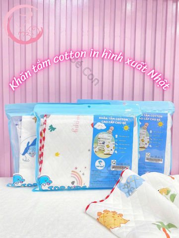 Khăn tắm cotton in hình xuất Nhật là sản phẩm đang được nhiều phụ huynh tin dùng cho bé yêu của mình. Với chất liệu cotton mềm mại, sản phẩm giúp cho việc tắm cho trẻ trở nên dễ dàng và thoải mái hơn. Hơn nữa, các hình in đáng yêu xuất hiện trên khăn tắm còn làm cho bé thích thú hơn khi tắm.