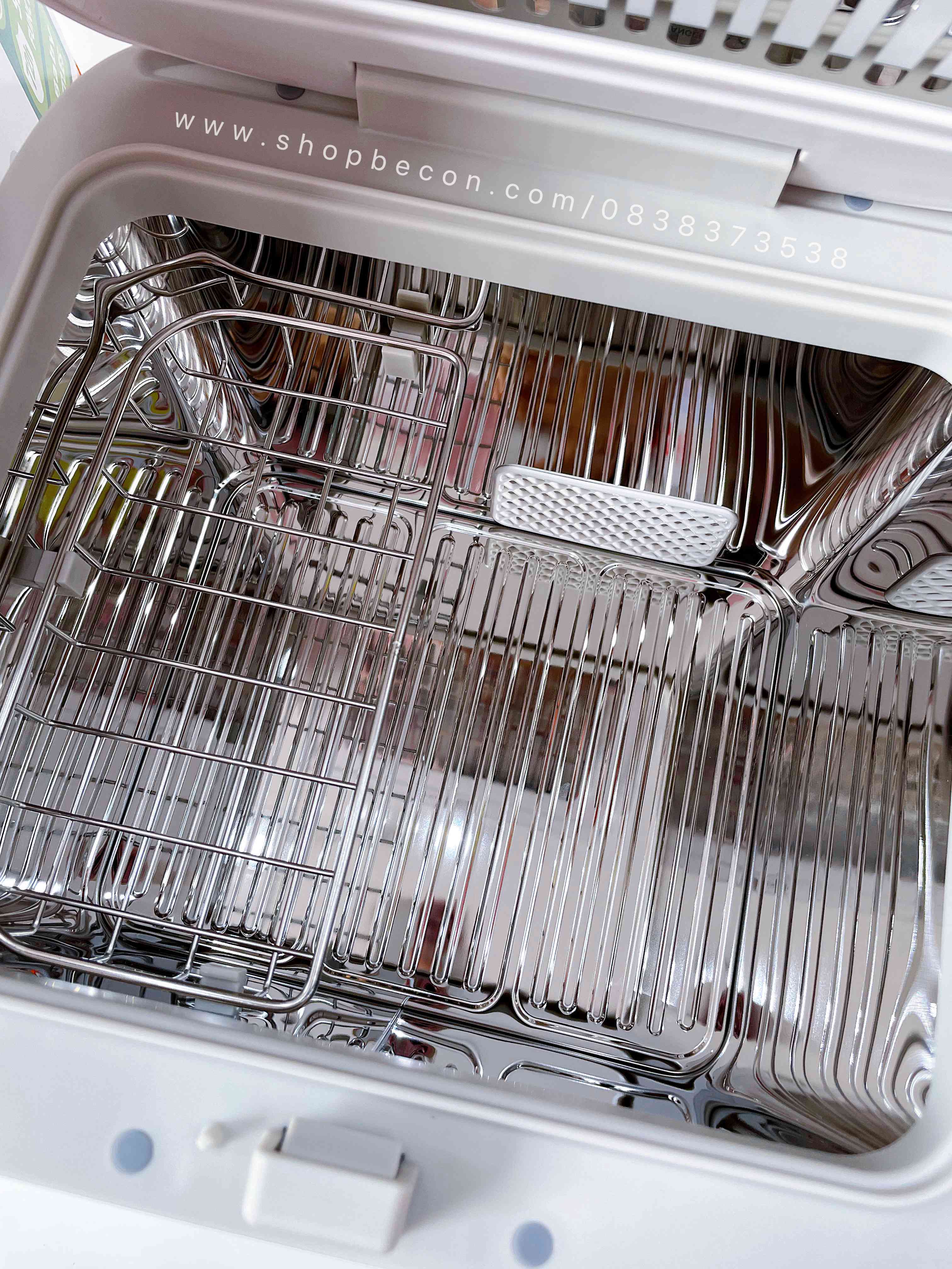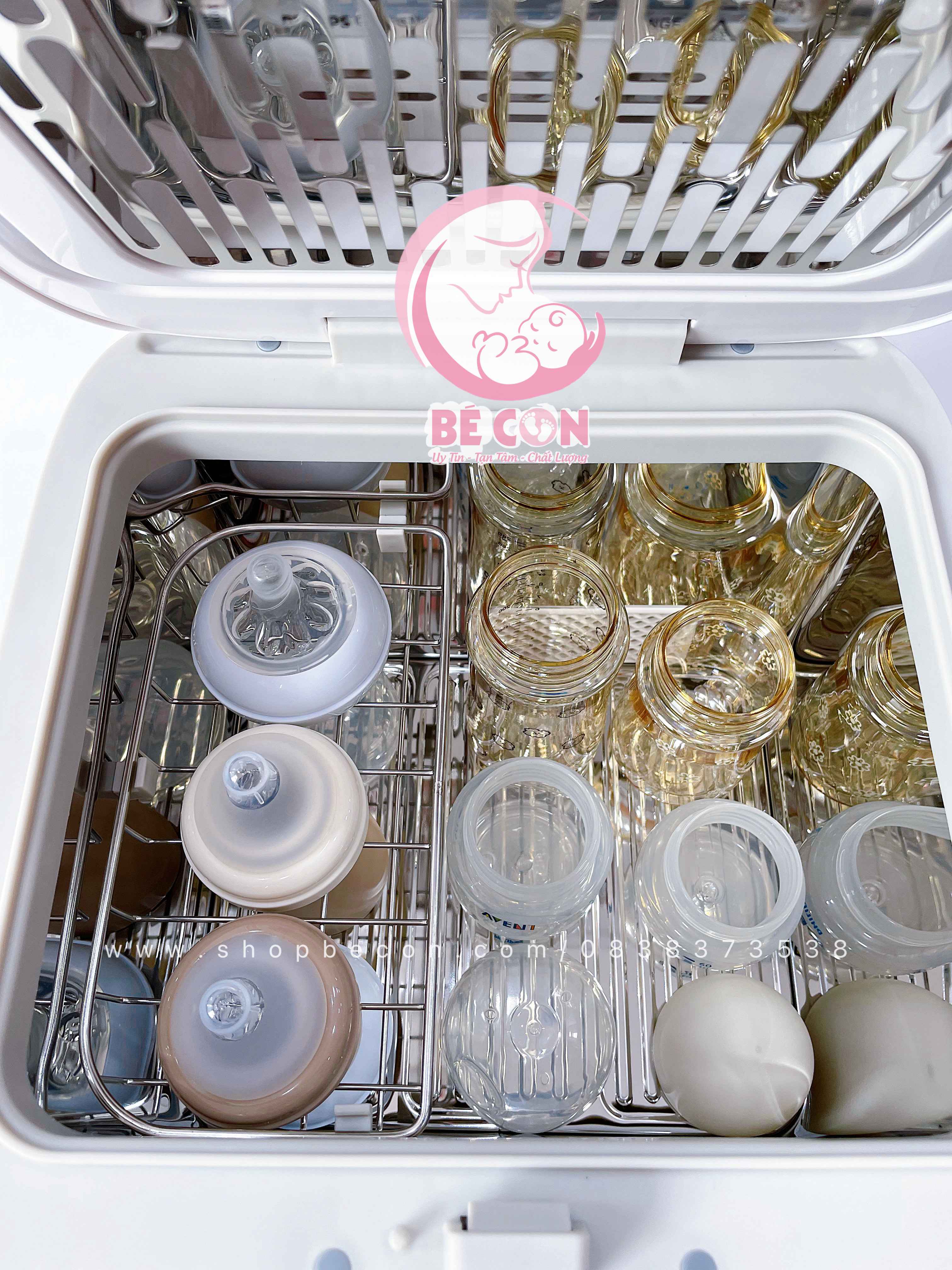 - Thể tích 10 L có thể chứa 9 bình cổ rộng: Với thể tích này mẹ sẽ không còn phải lo lắng khi qúa nhiều vật dụng cần tiệt trùng cùng một lúc, đôi lúc 1 con gấu bông cũng có thể để vưà trong máy tiệt trùng.