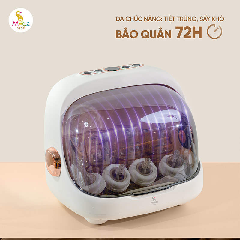 - Được tích hợp nhiều chức năng: tiệt trùng, sấy khô, bảo quản và úp bình sữa.