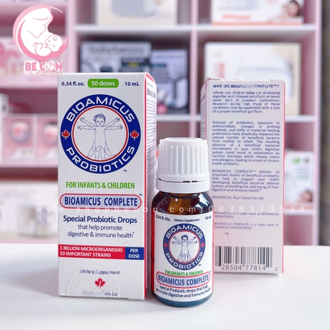 Men vi sinh 10 chủng BioAmicus Complete 10ml là men vi sinh 10 chủng đầu tiên và duy nhất hiện nay được nhập khẩu nguyên chai từ Canada. Với công thức đột phá chứa 10 chủng lợi khuẩn cần thiết có mặt ngay trong đường ruột của trẻ là Lactobacillus và Bifidobacteria, sản phẩm men vi sinh 10 chủng BioAmicus Complete là sự lựa chọn lý tưởng để giải quyết vấn đề tiêu hóa của trẻ. Mẹ chỉ cần nhỏ từ 5-10 giọt men 10 chủng mỗi ngày, không chỉ đơn thuần giúp trẻ cải thiện hiệu quả tình trạng biếng ăn, kém hấp thu và rối loạn tiêu hóa mà còn tăng cường sức đề kháng. Do đó bé giảm hẳn tình trạng ốm vặt và giảm tỷ lệ sử dụng kháng sinh.