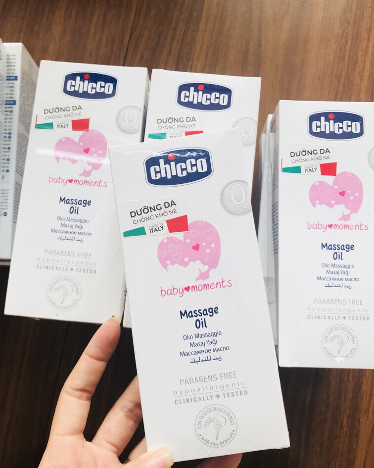 Sản phẩm của Italia, đã được Cơ quan Quản lý tại Hoa Kỳ, Nhật Bản, EU và hơn 100 quốc gia chứng nhận an toàn cho trẻ sơ sinh. Dầu mát-xa Chicco với các thành phần chiết xuất tự nhiên: tinh dầu cám gạo, vitamin E,...