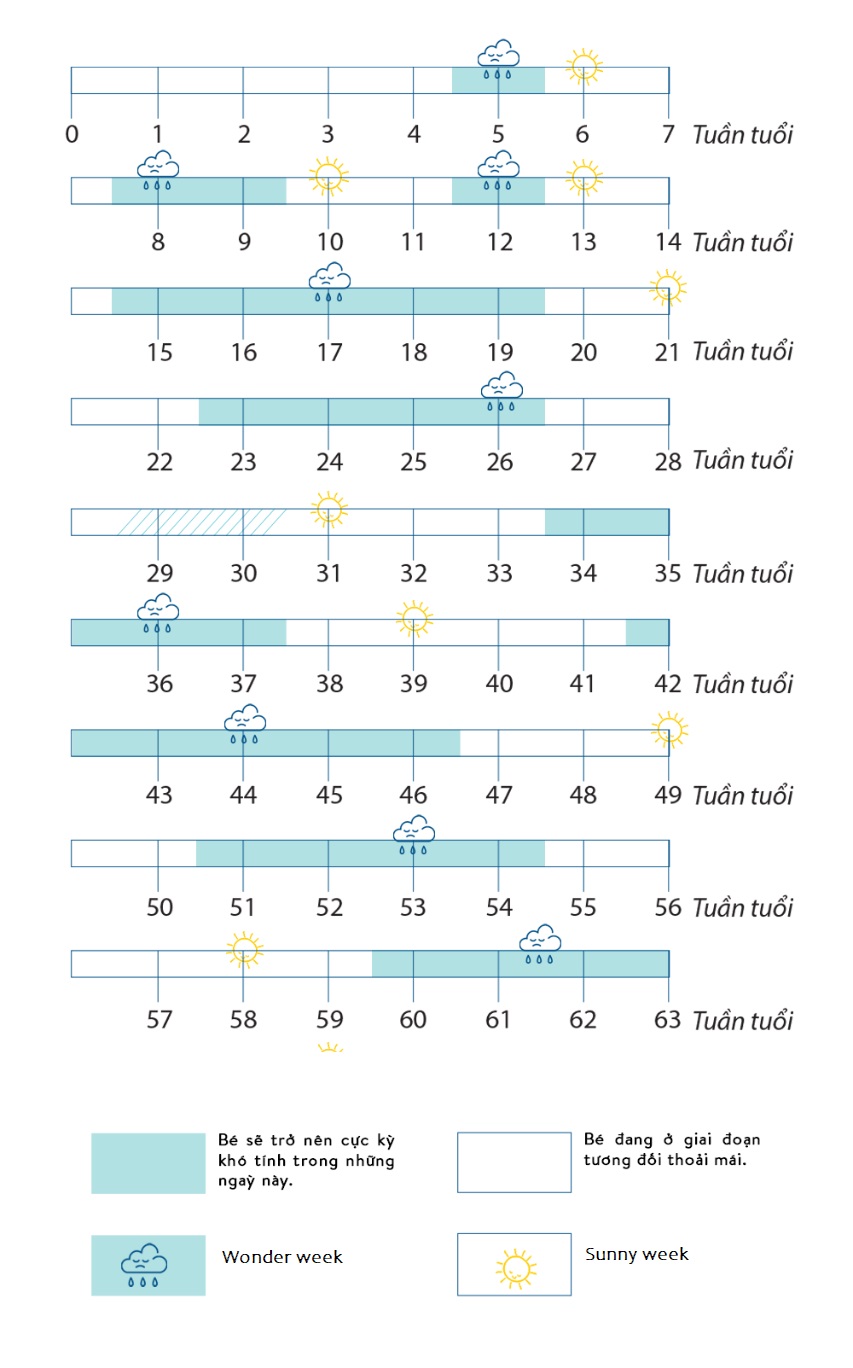 Mỗi Wonder week thường sẽ kéo dài khoảng 5 tuần, gồm hai giai đoạn là bão tố (stormy) và nắng đẹp (sunny).